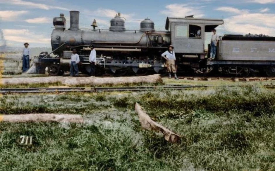 Primeiro dia de trabalho com a locomotiva 4 da E.F.M.M. (Foto: Dana Bernard Merrill I Colorida por Luís Claro)
