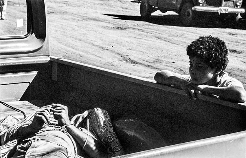 Kim aproximou-se e clicou o menino na parte traseira do veículo observando o corpo de um homem atingido pela própria motosserra. Ele trabalhava em derrubadas numa fazenda e após o acidente fatal foi levado para Vilhena. Curioso é que estava de mãos amarradas por uma corda.