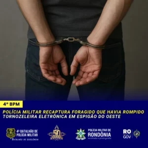 Na tarde de quinta-feira (02), a Polícia Militar, por meio de equipes de inteligência da PM, em Espigão do Oeste e Cacoal, com apoio do grupo Patamo Cacoal, realizou uma ação que resultou na recaptura de um homem que havia rompido a tornozeleira eletrônica para tentar fugir do monitoramento judicial.