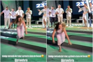 A secretária municipal de Cultura e primeira-dama de Cacoal (RO), Joliane Furia, viralizou nas redes sociais com o tombo que levou durante a festa do Ano-Novo no município.