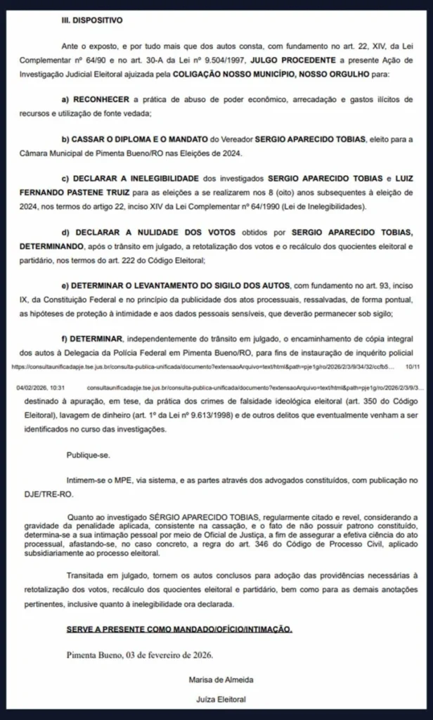 A Justiça Eleitoral determinou a cassação do diploma e do mandato, a anulação dos votos, a recontagem do resultado da eleição e ainda declarou a inelegibilidade por oito anos de Sérgio Aparecido Tobias (União Brasil), vice-presidente da Câmara Municipal de Pimenta Bueno. A decisão também atinge Luiz Fernando Pastene Truiz. A sentença foi assinada pela juíza Marisa de Almeida, titular da 9ª Zona Eleitoral do município, no dia 3 de fevereiro de 2026. Apesar da condenação, o vereador ainda pode recorrer da decisão.