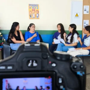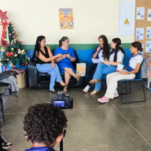 Todo o processo de construção do programa contou com a participação ativa dos estudantes do 6º ao 9º ano do Ensino Fundamental, que contribuíram para a escolha dos temas, definição do nome do talkshow, criação do mascote e organização das redes sociais do projeto.