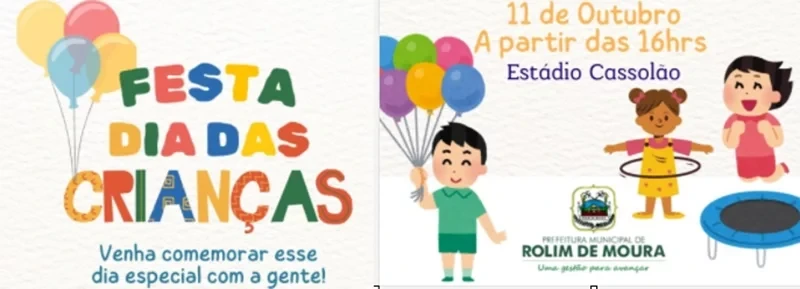 A Prefeitura Municipal de Rolim de Moura promove neste sábado, 11 de outubro, a tradicional Festa do Dia das Crianças, com uma programação especial voltada à diversão e lazer da garotada. O evento será realizado no Estádio Cassolão, a partir das 16 horas, e promete uma tarde repleta de alegria, brincadeiras e muitas surpresas.