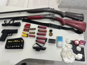 Uma ocorrência inicialmente registrada como violência doméstica terminou com a prisão de um homem suspeito de agressão, posse irregular de armas de fogo e tráfico de drogas, na manhã desta segunda-feira (9), na zona rural do município de Theobroma. Durante a ação, a Polícia Militar de Rondônia apreendeu espingardas, munições, materiais para fabricação de cartuchos, além de drogas e uma balança de precisão.