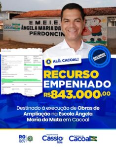 A educação de Cacoal recebeu um importante reforço. Um recurso no valor de R$ 843 mil já foi empenhado para a ampliação da Escola Ângela Maria da Mata, garantindo que o projeto saia do papel e avance para a fase de execução.