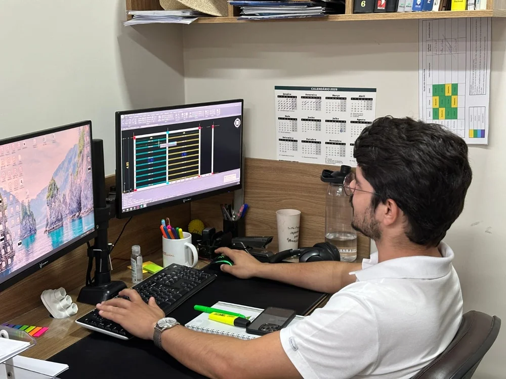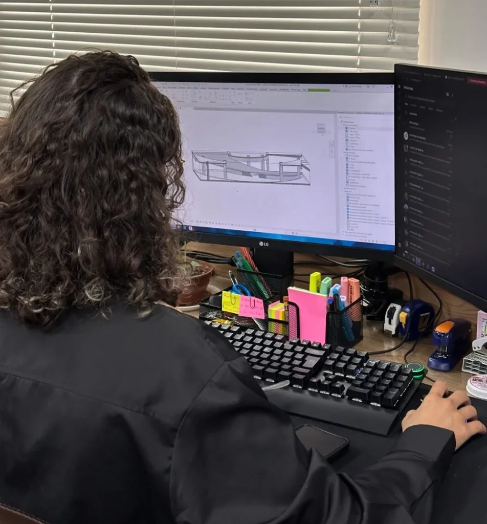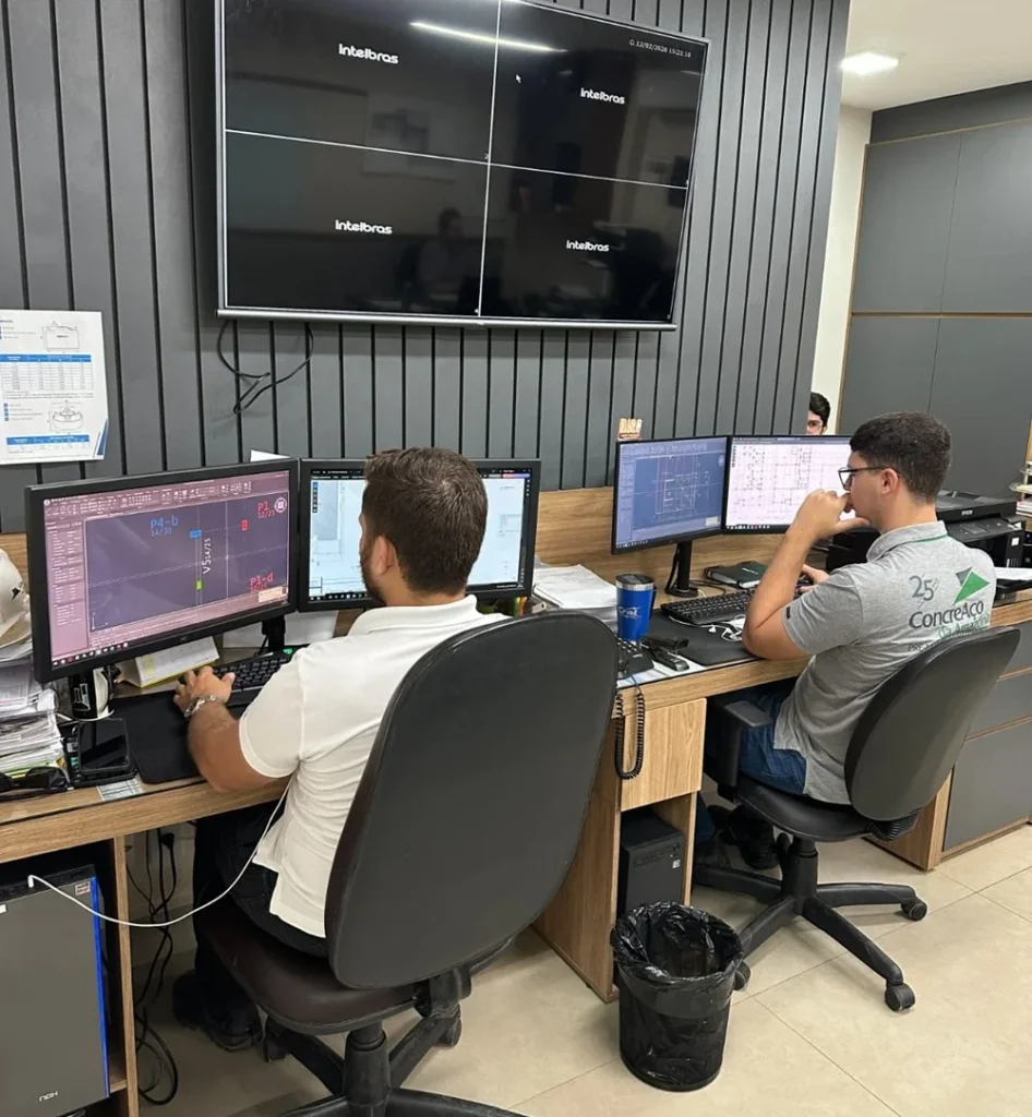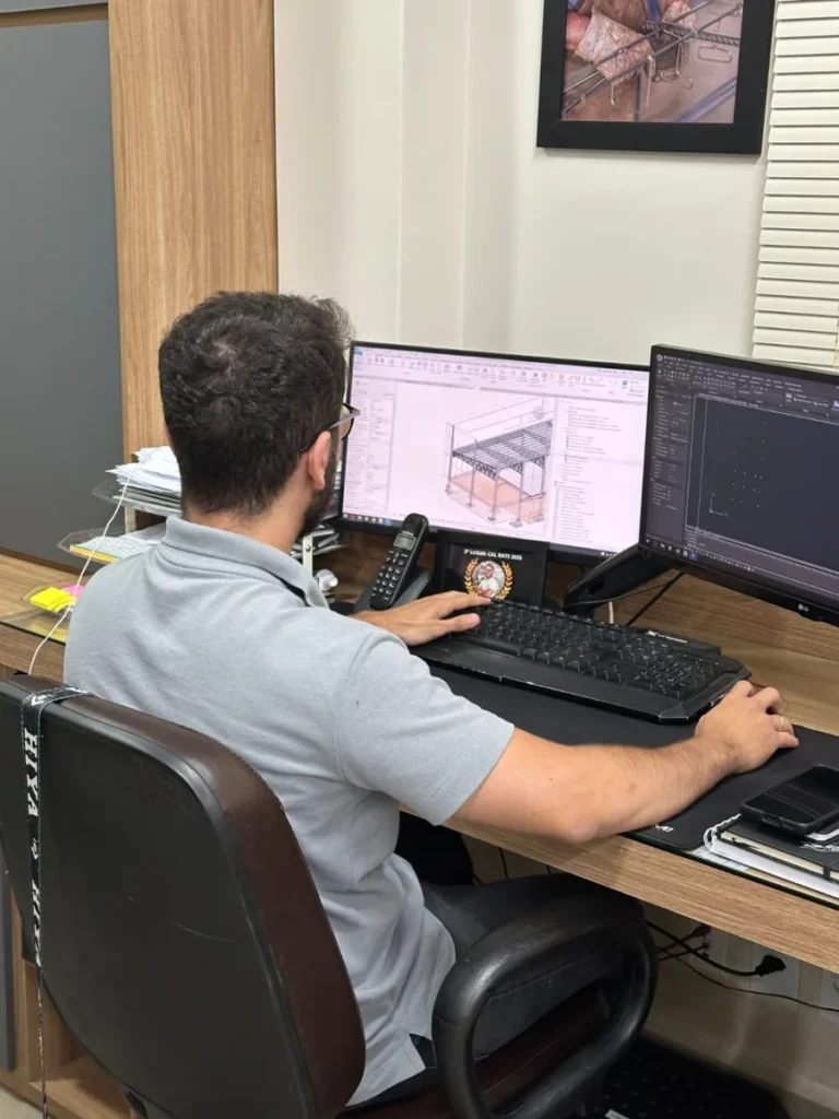 O processo começa no setor de projetos, onde engenheiros e projetistas utilizam softwares como TQS, AutoCAD e Revit para modelar cada elemento estrutural. Essas plataformas permitem simular cargas, esforços, encaixes e interferências, garantindo que pilares, vigas, lajes e painéis saiam da fábrica exatamente como foram concebidos no modelo digital.