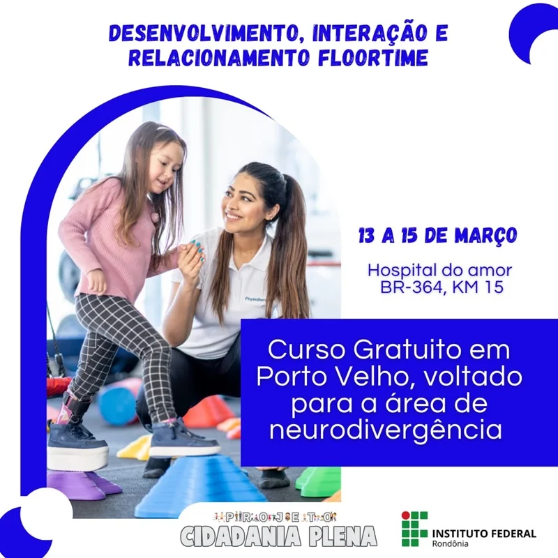 Inicia no Hospital de Amor, em Porto Velho, nesta sexta-feira (13) e segue até o próximo domingo, dia 15, o curso Desenvolvimento, Interação e Relacionamento Floortime, oferecido através do projeto Cidadania Plena, iniciativa do Ifro que é custeado com investimentos do mandato da deputada federal Silvia Cristina.