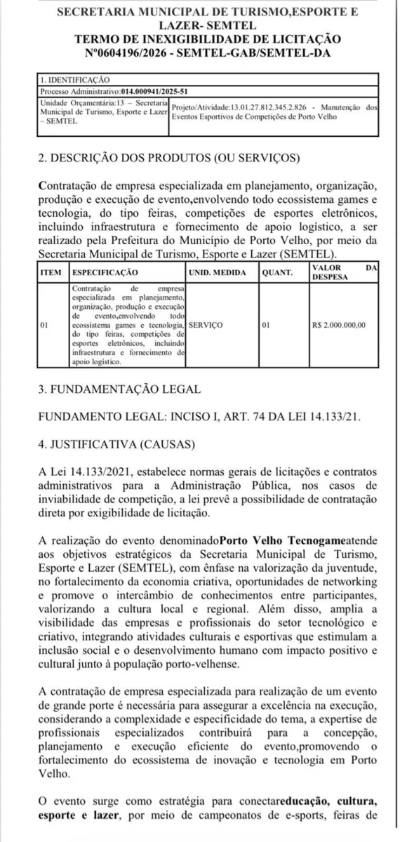 A contratação foi realizada por meio da Inexigibilidade de Licitação vinculada ao processo administrativo nº 014.000941/2025-51, que prevê a contratação da empresa Ayra Hub Inovações e Tecnologia Ltda para realizar o evento denominado Porto Velho Tecnogame, previsto para ocorrer nos dias 21 e 22 de março de 2026.