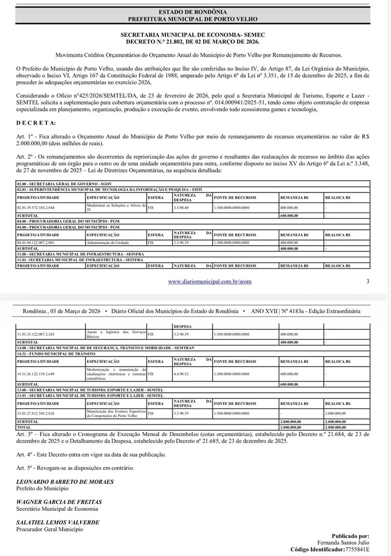 De acordo com o Decreto nº 21.802, publicado no Diário Oficial em 03 de março de 2026, a prefeitura realizou o remanejamento de R$ 2 milhões no orçamento municipal para viabilizar o evento. Os recursos foram retirados de quatro áreas da administração pública: SMTI – Superintendência Municipal de Tecnologia da Informação (R$ 600 mil de ações de modernização de tecnologia).