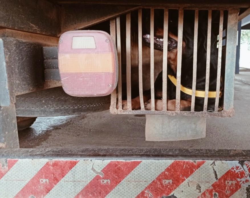 Em seguida, os policiais realizaram a abordagem do veículo e constataram um cachorro (Rottweiler), de aproximadamente 40 kg, no interior de uma caixa de ferro em mau estado de conservação e com dimensões desproporcionais para o seu tamanho, impossibilitando a movimentação e a respiração do animal.