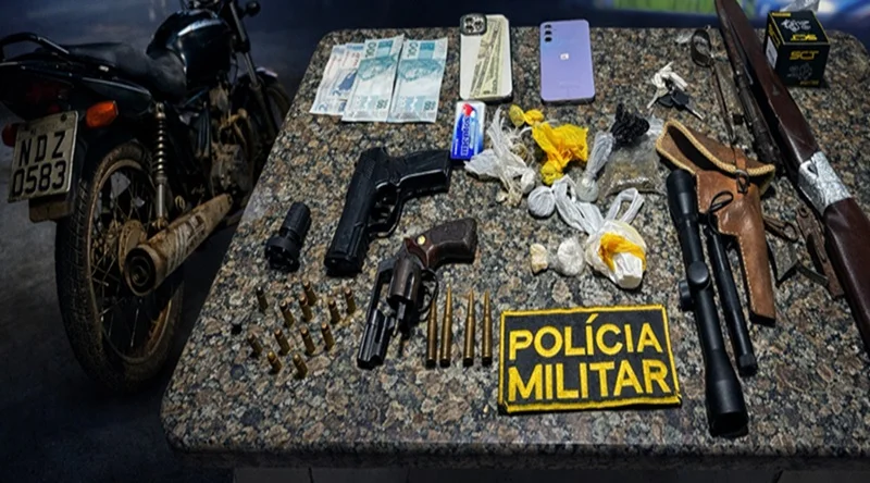 Nas buscas realizadas no local, foram encontrados um revólver municiado, munições adicionais, porções de maconha e, posteriormente, com apoio do canil, um fuzil aparentemente calibre 7.62 desmontado, quatro munições do mesmo calibre, porções de cocaína e crack, além de acessórios como luneta de precisão e mira laser.