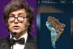A publicação foi feita neste fim de semana e faz referência ao cenário político da América do Sul, destacando países governados por lideranças de direita e liberais. A imagem circulou inicialmente em perfis alinhados ao governo argentino e foi republicada por Milei, acompanhada de uma legenda comemorando o que ele classifica como avanço da direita no continente.