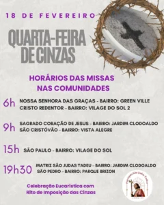 As paróquias de Cacoal realizam nesta Quarta-feira de Cinzas as tradicionais missas com imposição de cinzas, marcando o início da Quaresma no calendário da Igreja Católica. A data representa um momento de reflexão, penitência e preparação espiritual para a Páscoa.