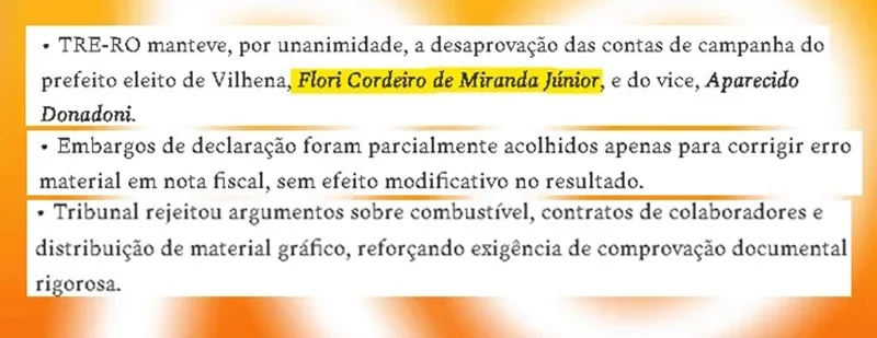 Recentemente, o Tribunal Regional Eleitoral de Rondônia manteve a desaprovação das contas de campanha da chapa formada por Flori e seu vice.