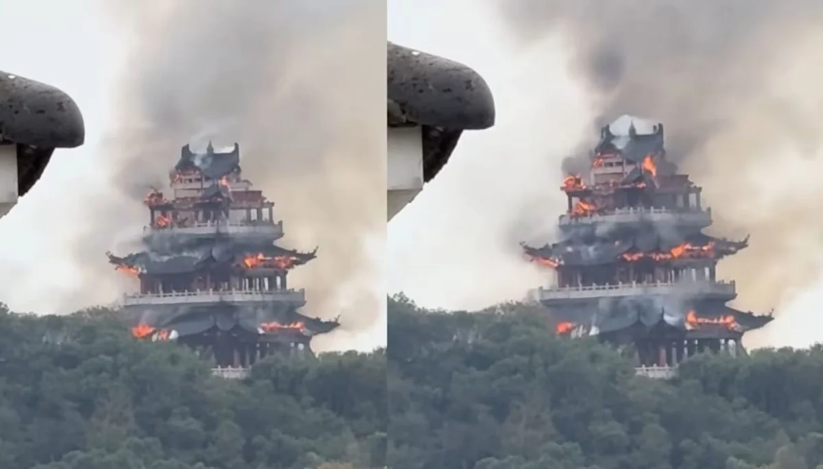 O fogo começou na quarta-feira (12) e rapidamente tomou conta da construção, que tinha três andares. Registros publicados nas redes sociais mostram o edifício já dominado pelas chamas e uma densa nuvem de fumaça escura subindo até o monte Fenghuang. O telhado desabou durante o incêndio, e a estrutura acabou completamente consumida. A velocidade com que as chamas se espalharam impressionou moradores e turistas.