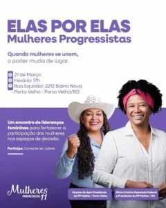 A presidente do PP Mulher em Porto Velho, Rayane do Agro, reforça que todas as mulheres estão convidadas para este momento de troca de experiências. “Esperamos as mulheres em nossa sede, na rua Equador 2212, no bairro Nova Porto Velho, para uma ação de fortalecimento de nossa luta por mais presença feminina na política e nos espaços de decisão”, completou Rayane. (Assessoria)