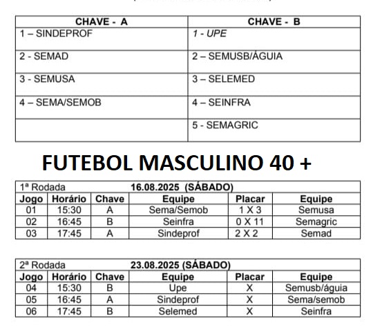 No último sábado, também no campo da sede social do SINDSPROF, começou o Campeonato Master Masculino de Futebol Society, com a realização de três partidas: SEMA/SEMOB 1 x 3 SEMUSA; SEINFRA 0 x 11 SEMAGRIC; e SINDSPROF 2 x 2 SEMAD.