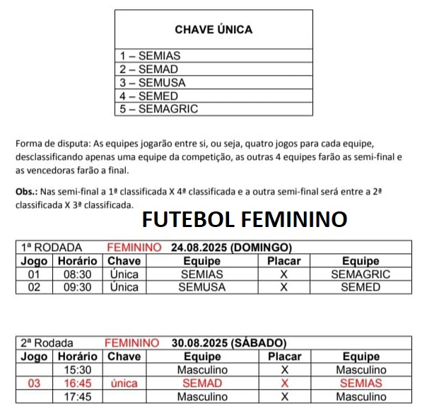 A rodada inicial terá o confronto entre as equipes da SEMIAS e da SEMAGRIC no primeiro jogo, e SEMUSA x SEMED na segunda partida. O campeonato tem cinco times inscritos e terá jogos aos sábados e domingos.