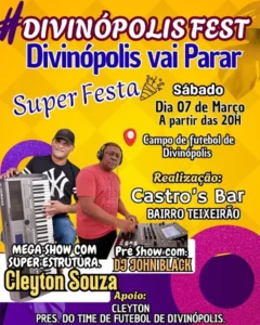 Uma grande festa está programada para agitar distrito de Divinópolis no sábado, dia 07 de março, a partir das 20h. O evento, denominado DIVINÓPOLIS FEST, promete ser uma super festa no campo de futebol de Divinópolis.