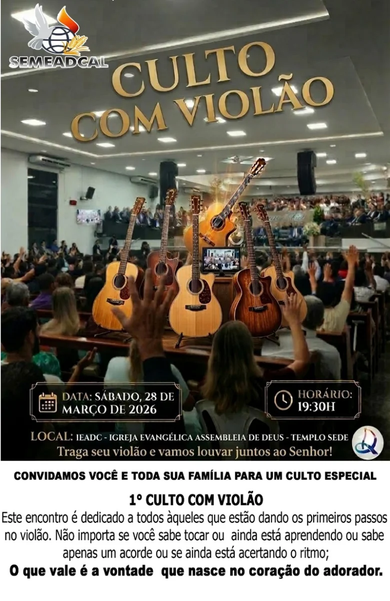 A Igreja Evangélica Assembleia de Deus – templo sede da IEADC, promove, neste sábado (28), às 19h30, um encontro especial voltado à música e à adoração coletiva. Intitulado “Culto com Violão”, o evento convida participantes de todas as idades e níveis de experiência a levarem seus instrumentos para um momento de louvor comunitário.
