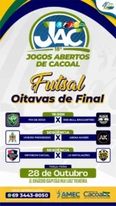O Ginásio Capitão Rui Luiz Teixeira recebe, na noite desta terça-feira (28), mais uma rodada dos Jogos Abertos de Cacoal (JAC), evento esportivo que chega à sua 18ª edição com ampla participação de equipes locais. A programação inclui três partidas de futsal masculino, com início previsto para as 19h30.