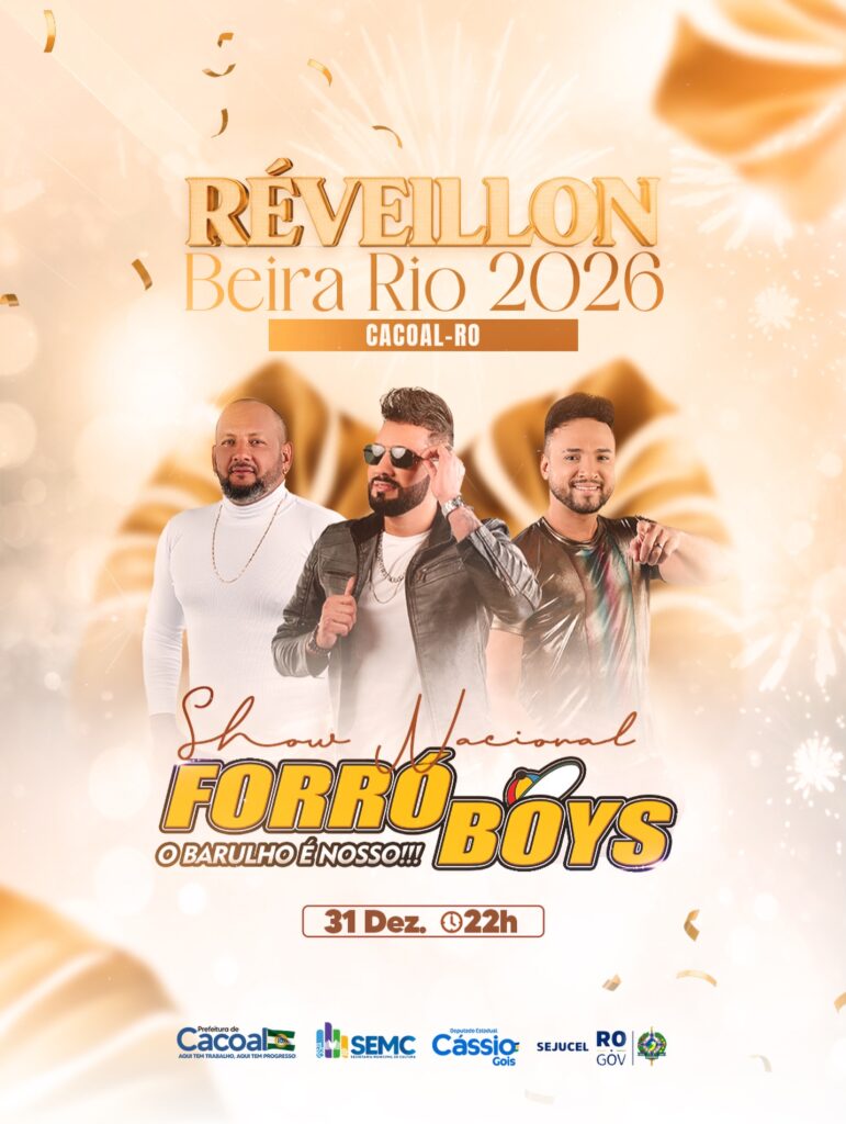 No dia 31 de dezembro, a partir das 22h, o palco montado na região do Beira Rio será tomado pela energia contagiante do grupo Forró Boys, atração nacional que promete levantar o público com seu repertório animado e dançante. Com o lema “O barulho é nosso!”, os artistas garantem uma virada de ano inesquecível.
